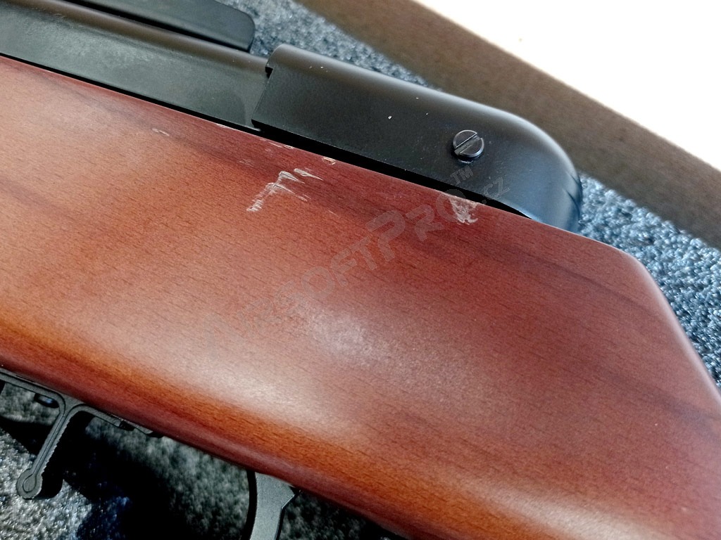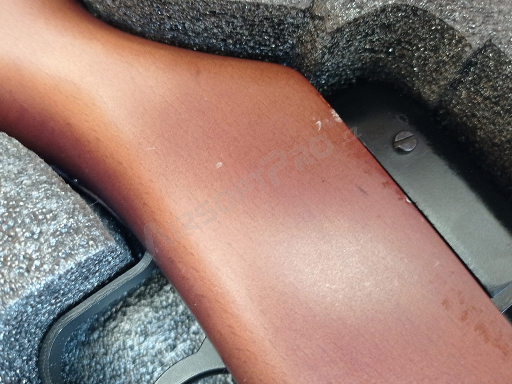 Ce classique des armes de la Seconde Guerre mondiale n'a plus besoin d'être présenté. Le PPSh ou "Spagin" était une arme typique de l'Armée rouge. Cette réplique est fabriquée conformément à son modèle réel, entièrement en métal et en bois véritable. Elle dispose également d'un système de recul électrique qui déplace non seulement le levier d'armement de la culasse, mais aussi la fenêtre d'éjection de la culasse lors du tir. L'arme est en bois très bien travaillé et son corps estampé est très réaliste.
