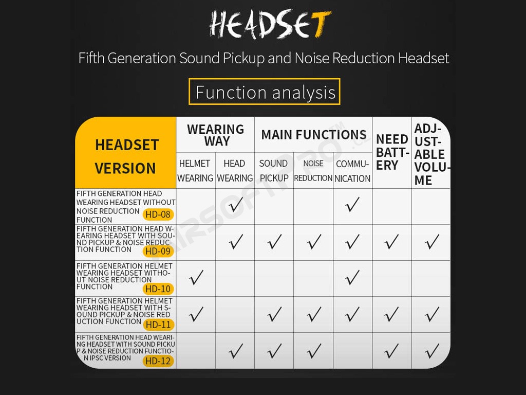 Remarque: le casque n'est pas doté d'une fonction active d'atténuation/amplification du son (réduction du bruit) et ne convient pas non plus comme protège-oreilles conventionnel. Il est conçu comme un casque ayant l'apparence d'un casque tactique. Les boutons d'amplification/atténuation du son et de commutation sont factices, de même que le compartiment à piles (le casque n'a pas besoin d'être alimenté).